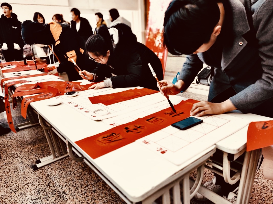 现场涌现出许许多多书法优秀的同学,笔走龙蛇,恣意挥洒,中华传统文化的底蕴在这一刻毫无保留地展现在同学们眼前,随着同学们在红纸上挥洒浓墨,一幅幅优秀的作品被创作出来,现场的氛围也达到了高潮,直至活动结束,同学们的热情依旧不减,激烈的讨论展现出同学们对于春联,对于中华传统文化的浓烈兴趣,现场创作春联的活动就在大家的欢呼与掌声中结束了。